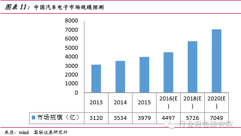 汽車電子類產(chǎn)品通常落后消費(fèi)類電子產(chǎn)品一個(gè)時(shí)期,正如過去幾年手機(jī)行業(yè)所經(jīng)歷的那樣,汽車業(yè)正在由“功能機(jī)”向“智能機(jī)”發(fā)展,這將給電子行業(yè)帶來新的增長(zhǎng)引擎。受惠于各國(guó)汽車安全政策加持,近期汽車電子輔助行車安全的趨勢(shì)已十分明確,越來越多類似TPMS、倒車影像、自動(dòng)剎車系統(tǒng)等新應(yīng)用崛起。各大車企、互聯(lián)網(wǎng)公司紛紛加快在車聯(lián)網(wǎng)和自動(dòng)駕駛領(lǐng)域的產(chǎn)業(yè)布局,車聯(lián)網(wǎng)有望成為第一個(gè)實(shí)現(xiàn)的物聯(lián)網(wǎng)應(yīng)用空間廣闊,存量與增量汽車市場(chǎng)規(guī)??捎^。2015 年中國(guó)汽車電子市場(chǎng)規(guī)模為3,979億元,同比增長(zhǎng)12.6%,2013~2015年中國(guó)汽車電子市場(chǎng)規(guī)模平均增長(zhǎng)率為13.7% 。中商產(chǎn)業(yè)研究院預(yù)測(cè)2016年中國(guó)汽車電子市場(chǎng)規(guī)模為4497億元。賽迪顧問預(yù)計(jì)到2016年中國(guó)汽車電子市場(chǎng)將保持 10%以上的增速,同時(shí)汽車電子在整車成本中的占比將超過50% 。我們判斷中國(guó)汽車電子市場(chǎng)增長(zhǎng)方式正在由汽車產(chǎn)量增長(zhǎng)轉(zhuǎn)向功能需求驅(qū)動(dòng)。