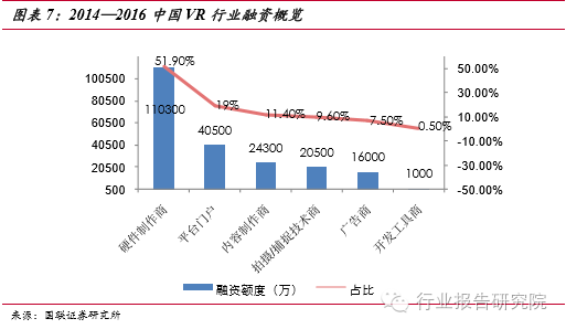 蓄勢(shì)待發(fā),爆發(fā)潛能驚人。VR 硬件包括輸出設(shè)備如 PC 端顯示頭戴,移動(dòng)端顯 示頭戴,以及輸入設(shè)備如手柄,跑步機(jī),動(dòng)作捕捉識(shí)別設(shè)備,全景相機(jī)等。國(guó)內(nèi)目前融資最大的一塊就是硬件制作商,占比達(dá)到 51.9%,這也說明了國(guó)內(nèi)的 VR市場(chǎng)還處在初期,國(guó)外的VR已經(jīng)形成了產(chǎn)業(yè)化,國(guó)內(nèi)的市場(chǎng)雖然處于初期但是成長(zhǎng)的潛力確實(shí)非常大的。